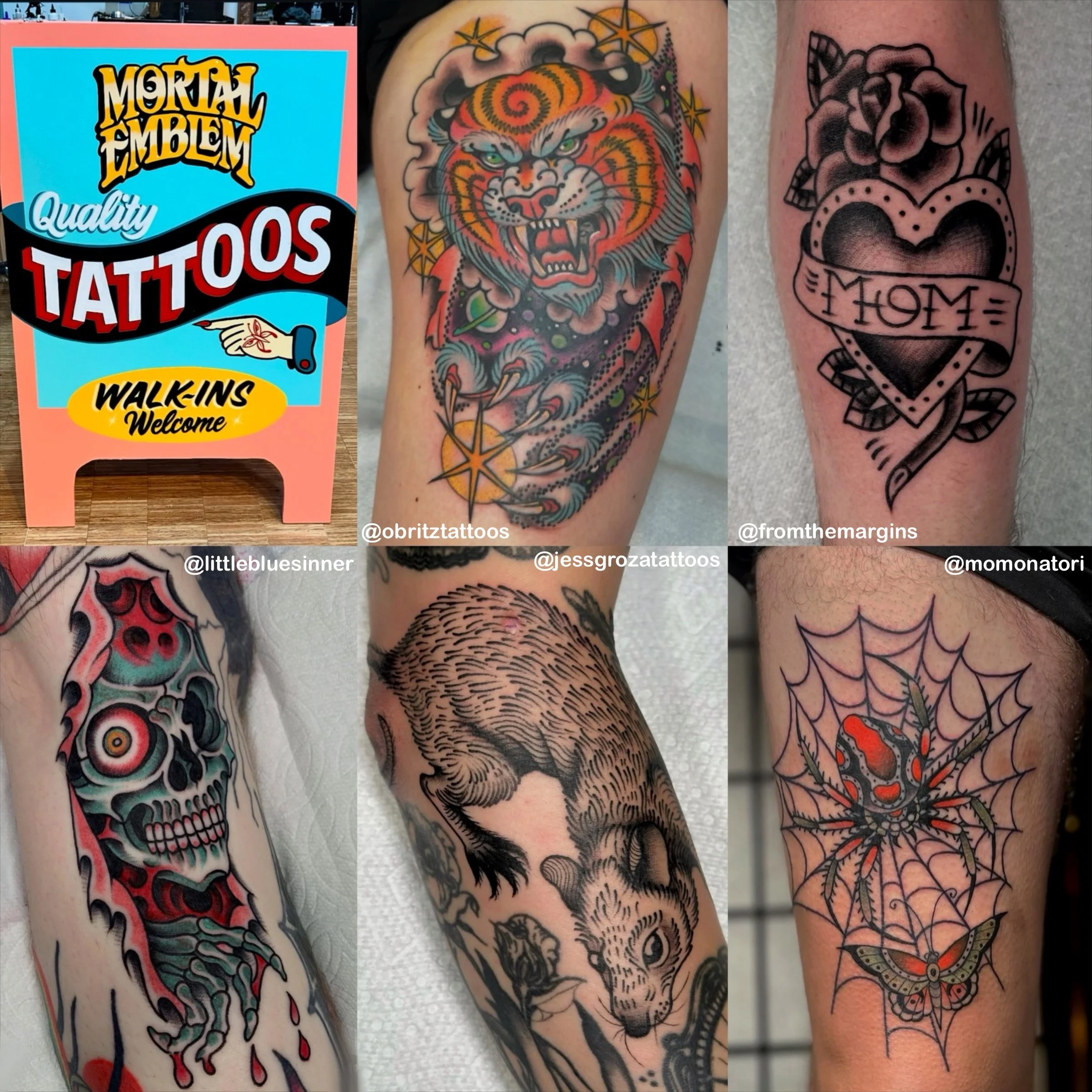 Mortal Emblem is a professional tattoo shop that offers high quality art in a sustainable, thoughtful, body positive, and energetic atmosphere.
